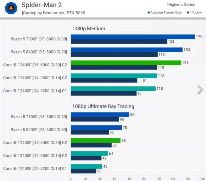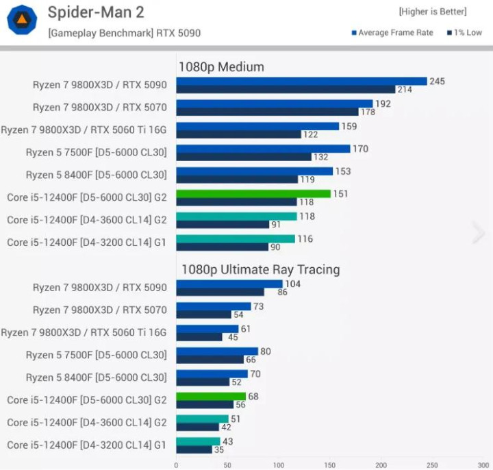 即使在《蜘蛛侠2》这样的游戏中,我们也看到了类似的性能趋势。在中等画质预设下,12400F搭配DDR4内存最高帧率达到118fps,搭配DDR5内存最高帧率达到151fps——这两个数字都相当不错。28%的性能提升并非RTX 5090显卡造成的误导,因为这款显卡在这里应该能够轻松达到200fps以上。