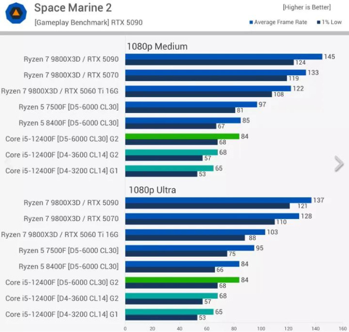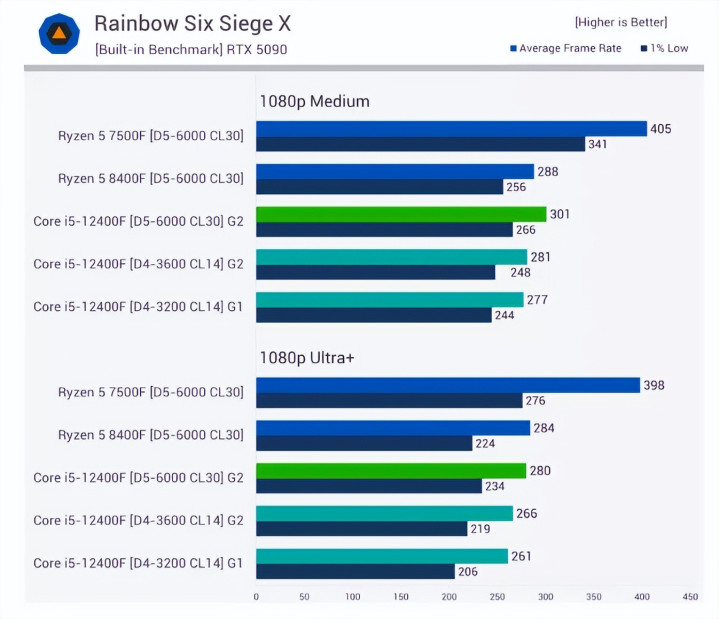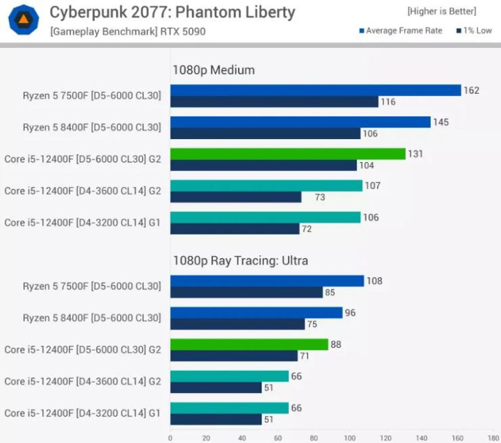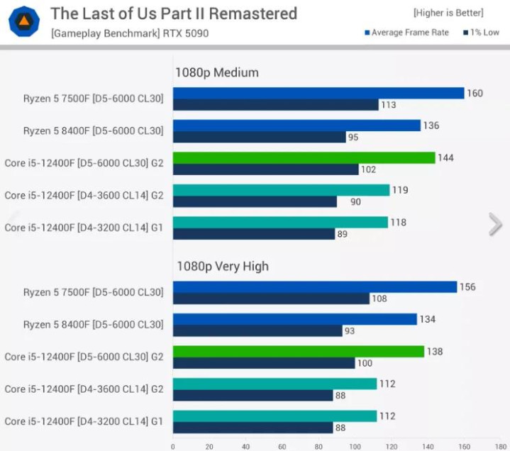 它也未告诉我们,我们需要 RTX 5090 才能揭示 DDR4 和 DDR5 之间真正的性能差异,甚至无法揭示 12400F 和 7500F 之间的差距。