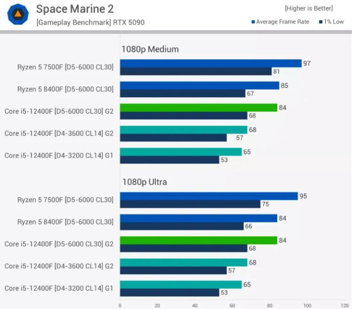 《太空陆战队2》是一款对CPU要求极高的游戏。在这款游戏中,配备DDR5内存的12400F性能提升显著,在中等或超高画质设置下均提升了24%。需要注意的是,该数据很大程度上受限于CPU性能,这意味着任何能够在您所选设置下达到80帧的GPU都能带来类似的性能提升。很多人对CPU测试存在误解:它最关注的是帧率,而非其他因素。